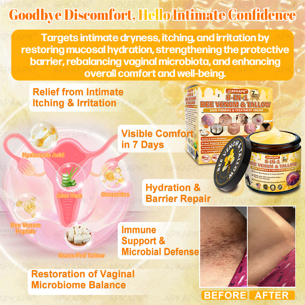 In response, APKAPKยฎ 8-In-1 Bee Venom & Tallow Skin Firming & Treatment Cream was scientifically developed under rigorous standards. Its formula combines the restorative power of natural bee venom and grass-fed tallow, synergized with hyaluronic acid, collagen, vitamin C, centella asiatica, and over ten other potent bioactive ingredients. Together, they deliver multi-dimensional care โ from deep hydration and barrier repair to anti-inflammatory relief, itch control, metabolic renewal, tissue restoration, and anti-aging nourishment.ย Clinically validated and produced in GMP-certified facilities compliant with U.S. and EU safety standards, this cream offers a safe, effective, and drug-free multi-repair skincare solution for dryness, inflammation, irritation, and signs of aging โ restoring comfort, resilience, and lasting skin health.